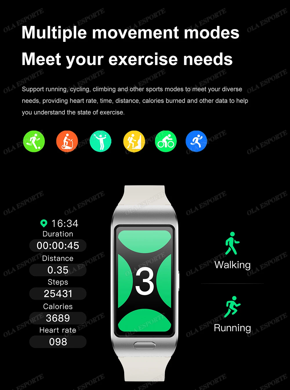 Bluetooth Call, heart rate, blood pressure, blood oxygen, sleep,weather, WeChat movement, information, reminder message, drink water, sedentary, alarm, games, ola esporte, stopwatch, countdown timer, ola esporte find mobile phone, find bracelet, music control, settings (language selection, Brightness Adjustment, Brightness Duration, Restore Factory, Version Information), Exercise, yeasmaie, Exercise History.