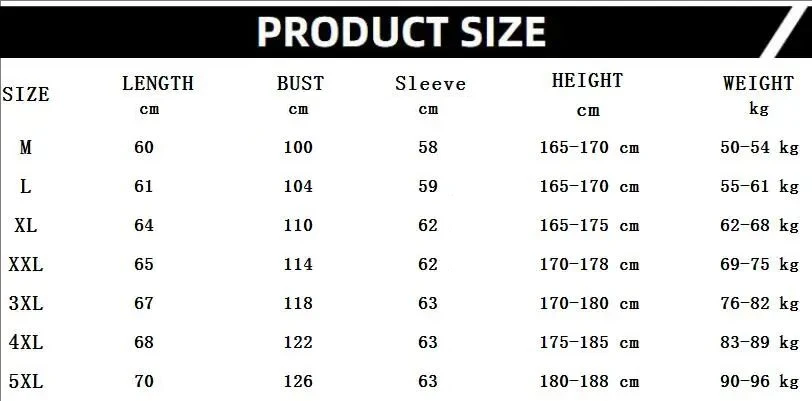size_info: {"sizeInfoList":[{"length":{"cm":"100","inch":"39.37"},"size":"M","vid":-1},{"length":{"cm":"104","inch":"40.94"},"size":"L","vid":-2},{"length":{"cm":"110","inch":"43.31"},"size":"XL","vid":-3},{"length":{"cm":"114","inch":"44.88"},"size":"XXL","vid":-4},{"length":{"cm":"118","inch":"46.46"},"size":"XXXL","vid":-5},{"length":{"cm":"122","inch":"48.03"},"size":"4XL","vid":-6},{"length":{"cm":"126","inch":"49.61"},"size":"5XL","vid":-7}]}